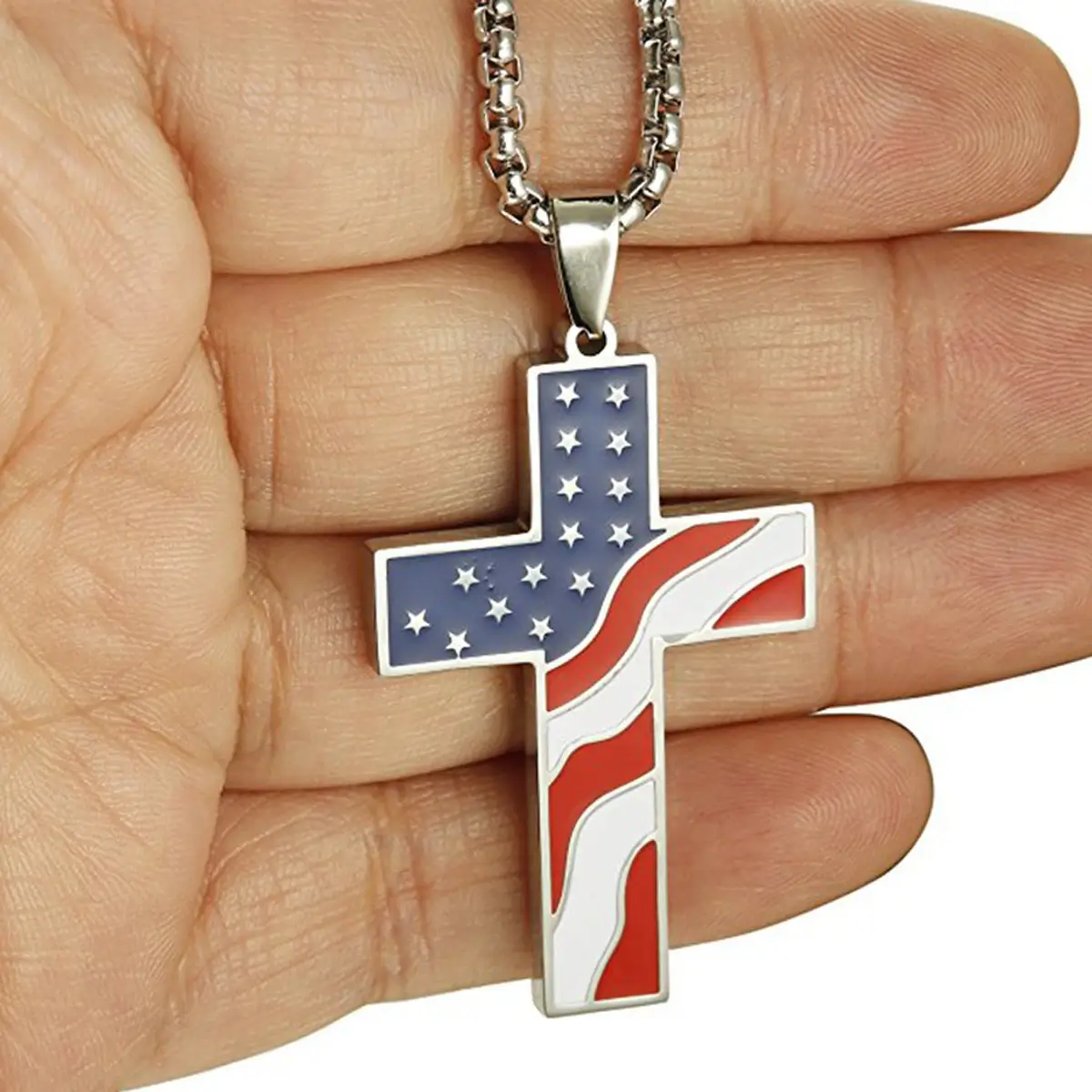 Celebrate your Christian faith and pride in the United States with this elegant cross necklace featuring the American flag design. Crafted from high-quality stainless steel, this accessory combines the symbolism of Christianity with a unique patriotic style. Perfect for special occasions like Independence Day, Memorial Day, or as a daily expression of your faith and patriotism. A meaningful gift for friends or family who cherish their spirituality and love for the country. With its durable chain and timeless design, this pendant serves as a constant reminder of faith and freedom.